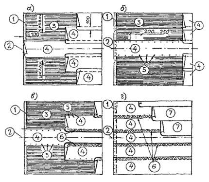 | Рис. 1 Последовательность (а, б, в, г) раскладки рулонных материалов при устройстве водоизоляционного ковра с механическим закреплением нижнего слоя.
