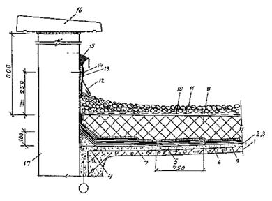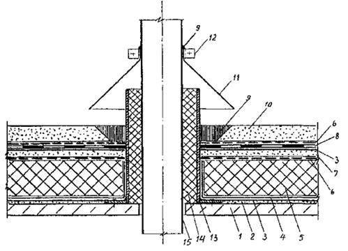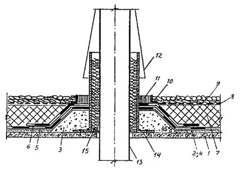 1 - несущая железобетонная плита; 2 - выравнивающая стяжка; 3 - наклонный бортик; 4 - огрунтовка; 5 - основной водоизоляционный ковер; 6 - дополнительные слои ковра; 7 - плитный утеплитель; 8 - геотекстиль; 9 - засыпка гравием; 10-рамка из уголка; 11 - герметик; 12 - защитный фартук; 13 - пропускаемая труба; 14 - стальной стакане фланцем; 15 - минераловатный утеплитель;