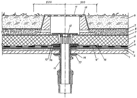 1 - несущая железобетонная плита; 2 - выравнивающая стяжка из цементно-песчаного раствора; 3 - огрунтовка поверхности под кровлю; 4; 4' - слой кровельного материала (усиление ковра); 5 - основной водоизоляционный ковер; 6 - плитный утеплитель; 7 - геотекстиль; 8 - дренажный слой; 9 - почвенный слой; 10 - бортовой камень; 11; 12 - защитная решетка; 13 - патрубок с фланцем; 14 - прижимной фланец; 15 - герметик; 16 - уплотнитель; 17 - хомут