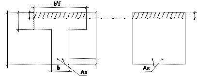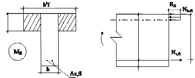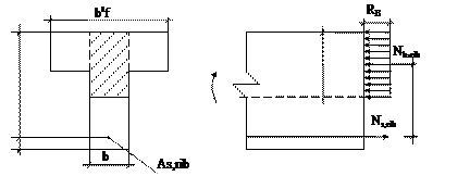 На сжатие работает бетон свесов полки, а на растяжение соответствующая часть всей арматуры As.rib. Данное сечение воспринимает момент: 6). Mfl=Nb, fl•z= Rb•(b'f-b)• h'f•(ho - h'f /2)(6) Из условия равенства «0» суммы проекций всех сил на ось элемента: Nb, fl= Nsfl Rb•(b'f-b)• h'f= Rs•As fl, откуда 7). As fl=Rb•(b'f-b)•h'f/ Rs (7) Эта арматура составлят только часть полной арматуры As, теперь будем находить остальную часть арматуры, соответствующую армированию ребра As.rib.