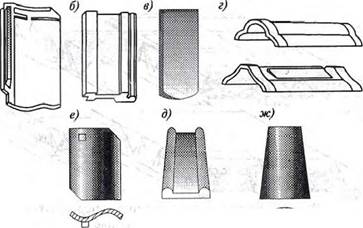 Наибольшее применение керамические изделия для кровли и черепицы нашли в западноевропейских странах, в некоторых из них кровля до 100% жилых зданий решается за счет применения черепицы. Черепица, имея долговечность до 300 лет, по этому показателю значительно превышает любые другие кровельные материалы, а по текстурным качествам и по стоимости не уступает им. К недостаткам черепицы относятся необходимость большого уклона (не менее 30%) кровли и значительный вес кровли, что требует особой прочности конструкции стропил, и высокая трудоемкость кровельных работ. Однако высокая долговечность, огнестойкость, устойчивость к атмосферным воздействиям и распространенность сырья делают керамическую черепицу одним из самых эффективных кровельных материалов. Известна черепица разных типов (рис. 5.6). По назначению черепицу подразделяют на: рядовую, коньковую, разжелобочную, концевую для замыкания рядов и черепицу специального назначения. Черепица производится из легкоплавких глин. Черепица при монтаже укладывается друг на друга и в связи с этим полезная площадь составляет соответственно у плоской - 50%, у штампованной и ленточной пазовой - 75-85%. При испытании черепица должна выдерживать не менее 70 кг при расстоянии между опорами у плоской - 180 мм, у ленточной пазовой и штампованной - 300 мм. Вес штампованной и ленточной