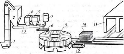 Приготовленный раствор сливают в свободную форму, расположенную на вращающемся столе карусельной машины, после чего стол поворачивается на одну позицию, а' следующую свободную форму снова заполняют раствором, где он схватывается и твердеет. Отформованная плита при помощи механизма выталкивается из формы, поступает на транспортер, а затем на вагонетке доставляется в туннельную сушилку. Плотность плит зависит от состава смеси и способа уплотнения. В среднем он составляет 1100-1300 кг/м3. Размеры плит 800x400 мм и 1500x400 мм (гипсокамышовых), толщина их - 80-100 мм. Панели для перегородок. Такие панели отличаются от плит большими размерами и большей прочностью гипсового бетона. Крупноразмерные гипсобетонные панели изготовляют в виде плиг толщиной 80-120 мм, шириной, равной высоте этажа, и длиной на комнату, а в отдельных случаях - на часть комнаты. В процессе изготовления в них можно закладывать дверные коробки и другие детали. Для санитарных узлов применяют гипсобетонные панели размером 2510x1700 мм. Плотность гипсобетонных панелей - 1500 кг/м3. При значительных преимуществах гипсобетонные панели тяжелы, а их сушка при массовом выпуске сопряжена с рядом технических трудностей. Более эффективными крупноразмерными изделиями для перегородок являются гипсоволокнистые панели, которые изготовляют из смеси гипса, воды и волокнистых заполнителей (бумажной макулатуры, стеблей, соломы, камыша, отходов текстильной промышленности и др.). Гипсоволокнистые панели хорошо пилятся и легко поддаются гвоздимости. Такие изделия выпускают размерами 3000x1200 мм и 2500x600 мм, толщиной 50 мм и плотностью 800-1100 кг/м'. Самым совершенным методом производства гипсовых панелей можно считать метод проката. Изделия формуют путем проката их между движущимися лентами, а затем их.подают на сушку в сушила (рис. 9.2).