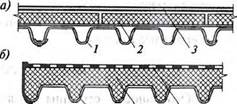 Рис. 16.3. Типы трехслойных панелей наружных стен: а) облицовка из плоских железобетонных плит; б) то же, из ребристых железобетонных плит; в) облицовка из конструктивно-отделочных листовых материалов (алюминия, асбестоцемента, стеклопластика); г) то же, с воздушным промежутком; 1 - наружная облицовка; 2 - внутренняя облицовка; 3 - утеплитель; 4 - пароизоляция Теплоизоляционные материалы широко применяют для утепления покрытий зданий (рис. 16.4). Рациональная эксплуатация ограждений возможна, если более проницаемые и малотеплопроводные материалы будут находиться с наружной стороны. Таким образом наружные стены или кровли должны работать как бы " в перевернутом" состоянии. Такие конструкции успешно эксплуатируются в Европе в течение многих лет благодаря пенопластовым теплогидроизоляционным материалам. Для повышения теплотехнических свойств уже существующих стен с внешней стороны наклеивают плиты утеплителя с дополнительной гидроизоляционной защитой. В нашей стране использование таких приемов имеет определенные трудности в связи с более суровым климатом.