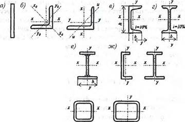 Основными конструктивными формами и назначением стальных конструкций являются: промышленные здания, каркасы и большепролетные покрытия общественных зданий, мосты и эстакады, башни и мачты, витражи, оконные и дверные заполнения, подвесные потолки и др. Первичными элементами строительных конструкций являются: -сталь листовая-толстая горячекатаная толщиной 4- 160 мм, длиной 6-12 м, шириной 0, 5-3, 8 м, поставляемая в виде листов и рулонов; тонкая горяче- и холоднокатаная, толщиной до 4 мм в рулонах; широкополочная универсальная толщиной 6-60 мм горячекатаная с обработанными, выровненными кромками; -сталь профильная - уголки, швеллеры, двутавры, тавры, трубы и т.п. (рис. 19.1), из которых компонуются различные симметричные сечения, обеспечивающие повышенную устойчивость и экономичность конструкций; -трубы горячекатаные бесшовные круглые диаметром 25-550 мм и толщиной стенки 2, 5-75 мм для радио- и телевизионных опор; -трубы электросварные круглые, диаметром 8 - 1620 мм и толщиной стенки 1-16 мм; квадратного и прямоугольного сечения с размерами сторон от 60 до 180 мм и толщиной стенки от 3 до 8 мм. Трубы применяются в конструкциях облегченных кровель, фахверках стен, переплетах, витражах; -холодногнутые профили, изготовляемые из ленты или полосы толщиной 1 - 8 мм (рис. 19.2). Основная область их применения - легкие экономичные конструкции покрытий здании.