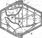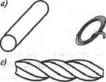 Рис. 20.1. Виды арматуры: а) гладкая стержневая; б) гладкая проволочная; в) горячекатаная периодического профиля; г), д) пряди из проволоки; е) холодносплющен- ная; ж) сварная сетка ния обозначают A-IVK-AVIK, термически обработанную свариваемую сталь - АШС, AIVC. Арматурная холоднотянутая проволока также может изготовляться гладкой (классов B-I и B-II) либо периодического профиля (классов Вр-I и Вр-П).' Высокопрочная проволока класса B-II намного превосходит обыкновенную класса B-I по механическим свойствам. В последнее время в железобетонных конструкциях в качестве ненапрягаемой арматуры предпочтение отдают стержневой арматурной стали классов А-Ш и Ат-IVC, а также арматурной проволоке Вр-I. К эффективным видам напрягаемой арматуры относятся стержневая арматурная сталь классов A-V, A-VI, Ат-V и At-VI, высокопрочная проволока и получаемые из нее арматурные канаты. Наиболее употребительные виды арматурных сталей и их основные характеристики приведены в табл. 20.1. Приготовление бетонной смеси Бетонные смеси приготовляют в бетоносмесительных цехах предприятий сборного железобетона или на автоматизированных бетонных заводах. Приготовление бетонной смеси должно обеспечить получение однородной массы. Оно состоит из точного дозирования и смешивания исходных материалов. Составляющие материала дозируют по массе (исключение допускается для воды). Применяют дозаторы с автоматическим и ручным управлением - последние для малых бетоносмесительных установок. В автоматических дозаторах с центрального пульта управления осуществляется установка аппаратуры на требуемую массу. Допускаются отклонения при дозировании цемента и воды ±1%, для заполнителей - ±2% (по массе). Бетоносмесительные машины циклического действия подразделяют на гравитационные и с принудительным смешиванием. Для получения подвижных бетонных смесей применяют гравитационные бетоносмесители, работающие по принципу свободного падения перемешиваемого материала. При вращении барабана смесителя (рис. 20.2) внутренние лопасти захватывают бетонную смесь, поднимают ее, затем бетонная смесь свободно падает с некоторой высоты и при этом перемешивается. Время перемешивания, необходимое для получения однородной бетонной смеси, зависит от емкости барабана и подвижности смеси и составляет: для смесителей емкостью до 500 дм3