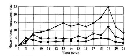 Рис. 2.4. Временная неравномерность пешеходного движения: - улица в промышленной зоне; - привокзальная площадь; - площадь в центре города