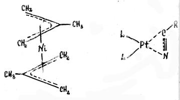 Или, например, в биc-π -аллильном комплексе никеля (см. рис.) каждый аллильный лиганд занимает 3 места в координационной сфере металла