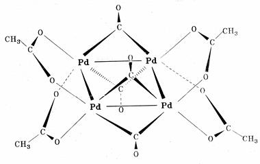 Рис. 3. Структура карбонилацетатного комплекса палладия(I) Кроме указанных характеристик, важно различать монодентатные и полидентатные лиганды. Монодентатные лиганды используют только один атом в качестве донорного атома в данном комплексе и занимают одно координационное место у металла-комплексообразователя. Лиганды, обладающие двумя и большим числом донорных атомов, называют полидентатными (би-, три-, тетра- и т.д.) лигандами. Например, в вышеприведенном карбонилацетатном комплексе палладия монооксид углерода – монодентатный лиганд, а ацетат – бидентатный лиганд. Полидентатные лиганды, строение которых позволяет осуществить одновременно координацию двумя или большим числом донорных атомов с одним и тем же комплексообразователем, называют хелатными лигандами. По количеству атомов металлов, содержащихся в комплексе, различают моноядерные и многоядерные комплексы (димерные, тримерные, тетраядерные и т.д.). Многоядерные комплексы делят на мостиковые (металлы соединены мостиковыми лигандами) и кластеры, содержащие связи металл-металл. Связь «металл-металл» может реализоваться и при наличии мостикового лиганда, соединяющего те же металлы. Например, карбонилацетат палладия является тетраядерным комплексом, содержащим две связи «палладий-палладий» длиной примерно 0, 26 нм, одновременно с которыми те же атомы палладия связаны двумя парами карбонильных мостиковых лигандов. Две другие стороны четырехугольника, образованного атомами палладия, длиннее связи палладий – палладий в металле – примерно 0, 29 нм (рис. 3). Два димера Pd(I) в этом комплексе связаны ацетатными мостиками.
