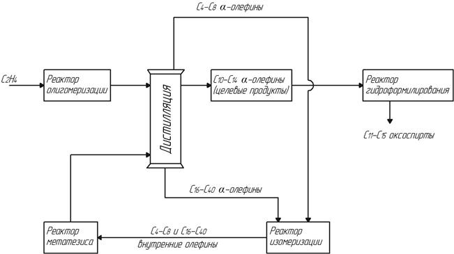 Олигомеризация этилена в растворе никелевых комплексов в двухфазной системе позволяет получить широкую фракцию α -алкенов с четным числом атомов от 4 до 40, которая делится в подсистеме разделения на три фракции: а) низкомолекулярные алкены с длиной углеродной цепи от 4 до 8, б) целевая фракция С10-С14, непосредственно поступающая на стадию гидроформилирования, в) высокомолекулярные алкены С16-С40. Фракции а) и в) поступают на стадию изомеризации, продуктами которой являются внутренние алкены. Например: