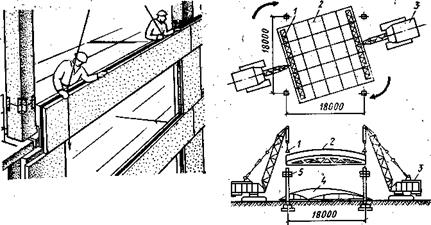 Оболочки двоякой кривизны, цилиндрические оболочки, складчатые покрытия и т. д. собирают с опиранием на несущие конструкции здания (рис. XI. 39). При этом применяют предварительную наземную укрупнительную сборку и грузозахватные устройства, исключающие возникновение в элементах монтажных напряжений. Этим методом можно собирать оболочки двоякой кривизны размером 12Х18...24Х36 м, устанавливая укрупненные элементы непосредственно на контурные фермы оболочек. Элементы укрупняют на земле в зоне действия монтажного крана на специальных передвижных стендах-кондукторах.