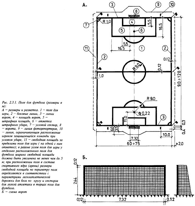 Легкая атлетика и футбол — самые популярные во всем мире виды спорта. На открытом воздухе футбол с легкой атлетикой объединяются на одном, общем для них сооружении - спортивном ядре (спортивной арене), что и принято в Российской Федерации. За рубежом имеются футбольные поля без круговой легкоатлетической дорожки для бега. В соответствии с требованиями международных правил прямоугольное в плане поле для футбола может иметь длину 90-120 м и ширину 45-75 м (рис. 2.3.1). Эти размеры относятся к так называемому «полю для игры», т.е. к той части поля, которая ограничена наружными линиями разметки (боковыми линиями и линиями ворот). На участке должны предусматриваться свободные полосы по периметру поля, из которых мячи, вышедшие из игры, вновь вводятся в игру. Для международных матчей «поле для игры» должно быть не менее 100 х 64м и не более 110 х 75 м. Такие же размеры приняты в Российской Федерации для республиканских и международных соревнований.