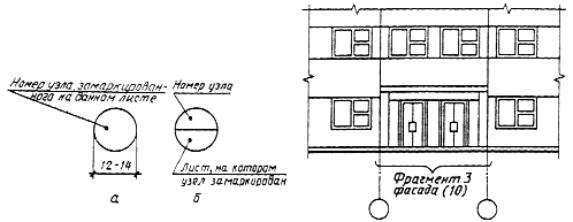 Рисунок 11 Если узел помещен на другом листе, то номер листа указывают под полкой линии-выноски (рисунок 10 а) или на полке линии-выноски рядом, в скобках, в соответствии с рисунком 10 б. При необходимости ссылки на узел, помещенный в другом основном комплекте рабочих чертежей, или на типовой узел, указывают обозначение и номер листа соответствующего основного комплекта рабочих чертежей в соответствии с рисунком 10 в или серию рабочих чертежей типовых узлов и номер выпуска в соответствии с рисунком 10 г. При необходимости, ссылку на узел в сечении выполняют в соответствии с рисунком 11. Над изображением узла указывают в кружке его порядковый номер в соответствии с рисунком 12 а или 12 б. Узлу, являющемуся полным зеркальным отражением другого (основного) исполнения, присваивают тот же порядковый номер, что и основному исполнению, с добавлением индекса «н». 5.20 Фрагменты планов, разрезов, фасадов, как правило, отмечают фигурной скобкой в соответствии с рисунком 13. Под фигурной скобкой, а также над соответствующим фрагментом наносят наименование и порядковый номер фрагмента. Если фрагмент помещен на другом листе, то дают ссыпку на этот лист. Допускается ссылку на фрагмент помещать на полке линии-выноски.