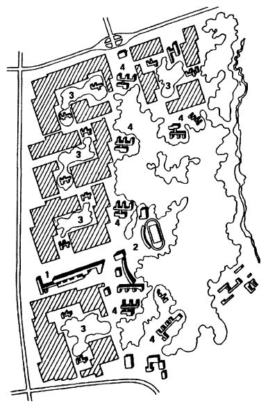 В центре преимущественно спортивном должны соблюдаться спортивные правила, нормы и требования. Трассы и дорожки целесообразно разме- 266 физкультурно-спортивные сооружения щать на периферии подзоны, в защитной зелени. Желательно их нерегулярное начертание. При невыраженном рельефе может потребоваться создание для трасс и дорожек рельефа искусственного. Суммирование всех условий размещения основных групп открытых сооружений позволяет дать общую картину размещения сооружений подзоны (см. рис.10.1.3). Поскольку расположение поясов полей и площадок фиксируется уже на стадии первоначального проектирования в виде сектора, расширять число полей и площадок можно лишь их наращиванием вдоль боковых сторон сектора, т.е. увеличением его угла. Зона отдыха. Планировочная организация зоны отдыха в наибольшей мере определяется ее размерами и ландшафтом(прежде всего — рельефом и размещением высокой зелени), который должен стать основой ее планировки. Здесь стоят задачи: размещение в пределах этой зоны части трасс для оздоровительного бега и ходьбы, кроссов, бега на лыжах и лыжероллерах, дорожек здоровья, велодорожек и т.п.; создание мест пассивного отдыха; эстетические и экологические задачи. Искусственных сооружений должно быть как можно меньше. Зона отдыха — самая стабильная. Наиболее динамичный ее элемент — трассы и дорожки, для которых надо резервировать территории. Планировочная организация должна исходить из минимальной площади застройки для хозяйственных или технических сооружений и хозяйственного двора, с их максимальной изоляцией, а иногда и заглублением. В этих целях рациональна непрерывная застройка вокруг внутреннего хозяйственного двора. Примеры архитектурно-планировочной организации физкультурно-спортивных центров различных уровней приведены на рис. 10.1.4 — 10.1.15.