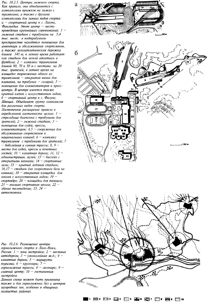 ний и функциональных связей и ограничений — остальные сооружения комплекса. Основные сооружения для профилирующих занятий по ведущему и дополнительному видам спорта резко различны по параметрам, когда предназначаются для спортивных или физкультурно-оздоровительных занятий, что определяет необходимость их специализации, а иногда и пространственной изоляции. До недавнего времени места отдыха стремились размещать на наиболее ценных ландшафтах. Сейчас — противоположная планировочная стратегия. Основное ее правило: чем больше концентрация отдыхающих, тем больше сооружений и элементов инфраструктуры должно быть в пределах территории, тем ниже должно быть качество используемого ландшафта. Таковы места массового отдыха и физкультурно-спортивные центры. Необходимость обогащения малоценных ландшафтов требует затрат. Поэтому здесь следует размещать прежде всего комплексы, нуждающиеся в изоляции от мест массового отдыха, в обширных зонах безопасности и вместе с тем не предъявляющие высоких требований к природной среде (комплексы для охоты, стрелкового, конного, велоспорта, биатлона). Ограниченность ресурсов природы требует размещения территориеемких загородных физкультурно-спортивных комплексов на землях, непригодных для строительства и сельского хозяйства. Примеры специализированных физкультурно-спортивных комплексов для различных видов спорта представлены на рис. 10.2.4- 10.2.6.