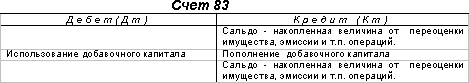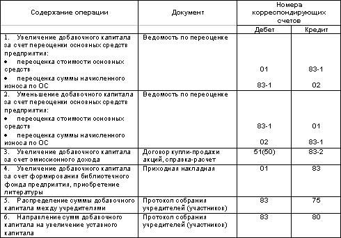 При переоценке имущества его стоимость может увеличиваться или уменьшаться. Увеличение стоимости имущества при переоценке основных фондов отражается по дебету счетов 01 «Основные средства» и кредиту счета 83 «Добавочный капитал» субсчет 83-1 «Прирост стоимости имущества по переоценке», уменьшение — по дебету счета 83 «Добавочный капитал» субсчет 83-1 «Прирост стоимости имущества по переоценке» и кредиту счетов 01 «Основные средства». На субсчет 83-2 «Эмиссионный доход» предприятия, созданные в форме акционерных обществ, зачисляют при формировании уставного капитала (при учреждении общества, при увеличении уставного капитала путем дополнительной эмиссии акций или повышения номинальной стоимости акций) сумму разницы между продажной и номинальной стоимостью акций, вырученной при реализации их по цене, превышающей номинальную стоимость. При этом делается запись по кредиту счета 83 «Добавочный капитал» и дебету счетов учета денежных средств или иных ценностей, переданных предприятию в оплату акций. Суммы, отнесенные в кредит счета 83 «Добавочный капитал», как правило, не списываются. Дебетовые записи по нему могут иметь место лишь в случаях: