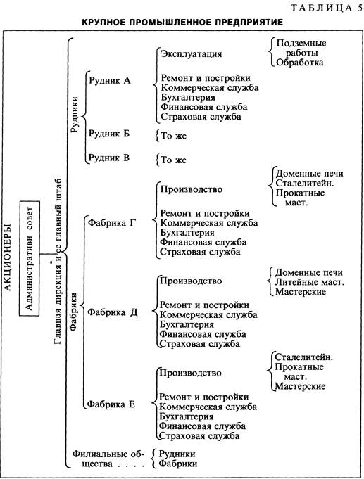Органами социального организма являются органы выполняющие шесть существенных функций. В простейшем предприятии они могут быть представлены одним служащим; в предприятии национального масштаба крайне усложнённые и разделенные эти функции требуют большого количества работников и ведут к созданию очень многочисленных органов и подорганов. Для изучения органов социального организма я возьму сначала в качестве примера, крупное промышленное предприятие — в форме анонимной компании — одновременно горное и металлургическое, дающее занятие десяти тысячам человек. На таблице 5 схематически представлен весь кадр работников. Идя справа налево, мы видим сначала группу акционеров затем административный совет, затем главную дирекцию. До этого момента идет сосредоточение власти. Начиная же отсюда, власть рассеивается и распространяется до крайних пределов предприятия, проходя через областные дирекции, местные дирекции и различных начальников служб. Можно различать в социальном организме анонимной компании следующие главные органы: 1. Группа акционеров 2. Административный совет 3. Главная дирекция и ее главный штаб 4. Областные и местные дирекции 5. Главные инженеры 6. Начальники служб 7. Заведующие мастерскими 8. Мастера 9. Рабочие