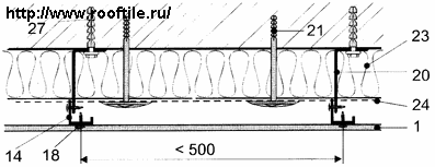 Ветрозащитная плёнка крепится к обрешётке строительным степлером, а затем прижимается брусом 50x50 мм с помощью оцинкованных гвоздей не менее 100 мм. Для металлического САЙДИНГА 4х5 шаг обрешётки не должен превышать 40-50 см. Чем выше этажность, тем меньше должен быть шаг обрешётки. Сайдинг крепится в обрешётку оцинкованным саморезом диаметром не менее не менее 4, 2 мм. При креплении в сталь используют саморез со сверлом. Наша компания предлагает несколько вариантов стальной обрешётки. Самый простой и дешёвый - с помощью оцинкованной вертикальной обрешётки. У неё есть несколько ограничений на применение: невозможность дополнительного утепления, минимальный вентиляционный зазор и низкая механическая прочность. Как следствие невозможность использовать её на строениях выше одного этажа (3 м) и при дополнительных механических нагрузках. Шаг такой обрешётки не может превышать 40 см, при этом на одно крепление сайдинга приходится вес менее 2 кг. Здесь и далее под шагом принимается расстояние между центрами элементов конструкции, а не расстояние между ними. На практике иногда применяют профили для гипсокартона, они также имеют тощину 0, 5 мм со всеми приведёнными выше ограничениями. Следующий по цене вариант крепления - с помощью вентилируемых прогонов (рис. 2) 0, 7 мм. Он отличается повышенной прочностью и улучшенной системой вентиляции, за счёт чего он может устанавливаться не только вертикально, но и горизонтально для монтажа панелей. Данная обрешётка также не предусматривает дополнительного утепления. За счёт большей толщины прогона сайдинг может монтироваться на высоту до 12 м, а шаг на высотах до 6 м увеличен до 50 см.