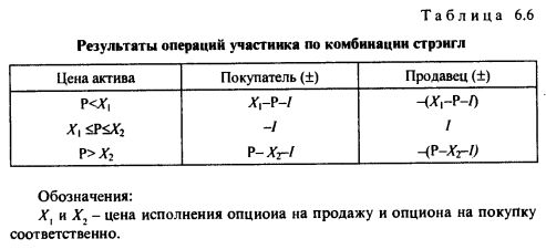 Стрэнгл опционов представляет собой сочетание опционов на покупку и на продажу на один и тот же актив, с одним и тем же сроком окончания контракта, но с разными ценами исполнения. Данная комбинация более предпочтительна, чем стеллаж для продавца опционов, так как дает возможность получить прибыль в более широком диапазоне изменения цен актива. В аналитическом виде результаты операций для покупателя и продавца опционов по комбинации стрэнгл приведены в табл. 6.6.