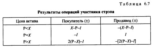 Стрэп – это комбинация из двух опционов на покупку и одного опциона на продажу с одинаковыми ценами и сроками исполнения. По всем опционам участник операции занимает одну и ту же позицию – или короткую, или длинную. Покупатель обращается к стрэпу, если полагает, что цена актива с большей вероятностью пойдет вверх, чем вниз. В аналитической форме зависимости для расчета результатов операций участников стрэпа приведены в табл. 6.7.