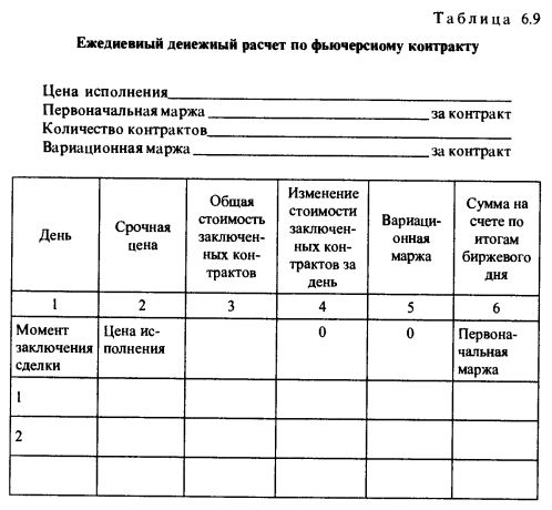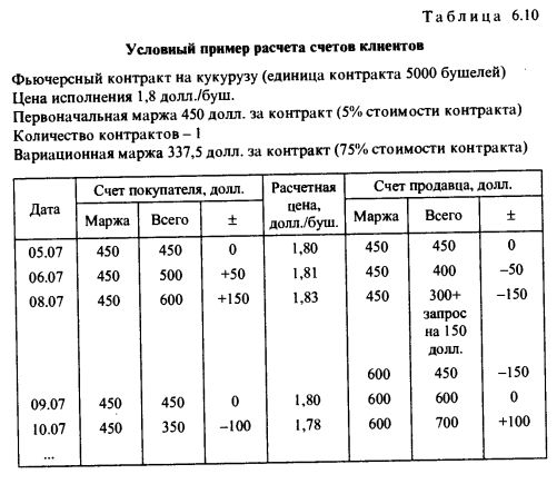 Если клиент имеет длинную позицию, а цены повысились, то сумма его средств будет увеличиваться, так как возрастает результат по открытым позициям. Выигрыш будет составлять разницу в стоимости его открытого контракта. Откуда приходят средства? Сумма средств на счете покупателя увеличивается за счет перевода денежных средств от других участников-продавцов, которые потеряли на своих позициях столько же, сколько другие выиграли. Если цены, наоборот, снизились, то выигрыши будут переведены на счета продавцов и списаны со счетов покупателей. Условный пример расчета состояния счетов покупателя и продавца фьючерсного контракта приведен в табл. 6.10.