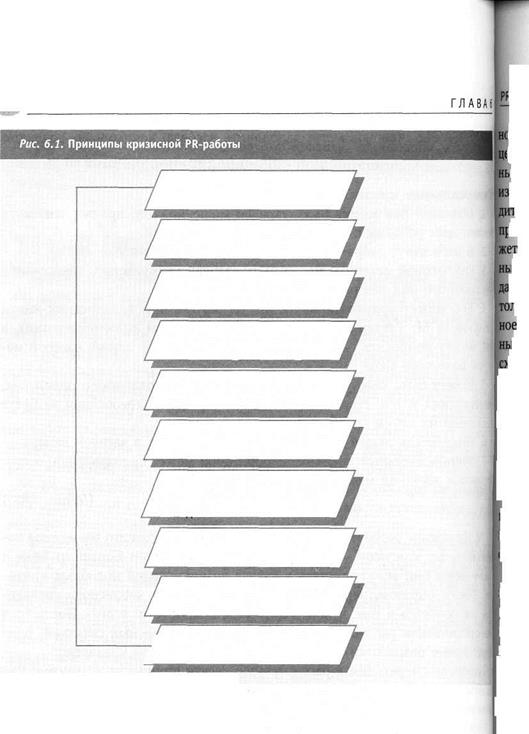 1. Большой Бен может быть украден мошенниками, притворившимися 2. В него могут забраться демонстранты, или фанатики. 3. Его часовой механизм может быть разрушен посредством какого-либо 4. Его может приватизировать М. Тэтчер (во время написания книги 5. Может быть разрушен в результате действий ирландских, ливийских, 6. Похититель людей может запереть свою жертву в часовой камере. 7. Законодательный орган Великобритании может принять закон о пре- (Jefkins, 1988) Ф. Джефкинс рассматривает также, сколько еще (если это возможно) потенциальных кризисов могут предусмотреть хранители Большого Бена и какиие меры они могут принять в случае возникновения подобных кризисов, Таким образом, первый шаг любой программы кризисного управления заключается в том, чтобы задать себе вопрос «что если?» После того организация рассмотрела возможные виды кризисных ситуаций, приходит время разработки конкретного плана кризисного управления. Теперь мы переходим к рассмотрению десяти принципов кризисной PR-работы, которые образуют своего рода костяк данной главы, и которые схематично изображены на рис. 6.1. Эти принципы были составлены на основании изучения обширной ли-тературы, посвященной проблемам кризисной PR-работы, а также на ос-новании личного опыта автора данной книги. Эти принципы могут послу-жуть своего рода наглядным пособием при планировании и реализации кри-зисной PR-работы. Для устранения последствий кризиса важно знать, как организации следует создавать свою репутацию по отношению к своему об-щественному окружению, а также как налаживать рабочие отношения с прессой для избежания возможных кризисов. Давайте теперь рассмотрим принципы кризисной PR-работы более подробно.