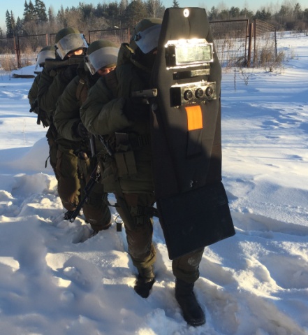 Группа состоит минимум из трех сотрудников, стандартная группа 4 бойца. В группе может находиться до 9 – 10 сотрудников. Всеми действиями руководит второй номер, все бойцы ориентируются, до получения команды, на щитового (сел - все сели, остановился – всем стоп). Построение боевого порядка группы: 1. Первый сотрудник со щитом. Вооружен пистолетом. Оружие в руке. Задача: Движение на опасность. В случае открытия огня по группе, прикрыть сотрудников, дать им возможность оказать противодействие. 2. Второй сотрудник за спиной первого сотрудника. Вооружен автоматическим оружием. Оружие в готовности к применению, находится с правой или левой стороны от первого сотрудника. Задача: Контроль действий первого сотрудника, подача команд и направление его движения, в готовности немедленно открыть огонь и оказание помощи. Первым сотрудником управляет второй, он же является старшим в группе. 3. Третий сотрудник двигается за вторым и прикрывает фланг и тыл двойки. Он же подает все сигналы сотрудникам идущим следом. Задача: По команде старшего группы (Второго сотрудника), используя помповое ружье или специальные средства открыть двери для входа внутрь, своевременно прикрыть специальными средствами действия напарников. Подать условные сигналы всей группе от первого сотрудника и команду о помощи в непредвиденных случаях. Тактический прием при подходе и движению за угол: №1.
