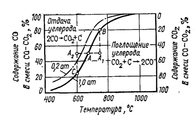 Здесь Рсо2, Рсо – парциальные давления двуокиси и окиси углерода в среде карбюризатора соответственно, ас - активность углерода, которая в среде карбюризатора равна единице, так как углерод присутствует в твердой фазе (при твердотельной карбюризации) Константа равновесия К зависит от температуры. Соответственно, соотношение между СО и СО2 так же зависит от температуры, как показано на рис 1. Из этого рисунка видно, что с повышением температуры возрастает доля СО в атмосфере карбюризатора