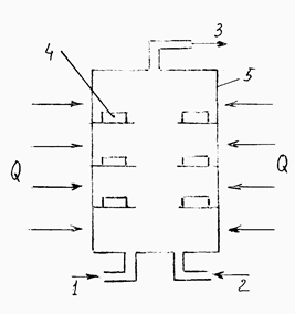 Рис 11 Схема получения эндогаза: 1- поступление метана, 2 – поступление воздуха, 3 – выход эндогаза, 4 – катализаторы, 5 - корпус реактора, Q – подогрев реактора внешними источниками тепла