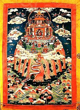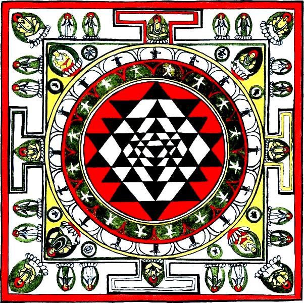 Одним из символов, являющихся восточным аналогом лабиринта, является мандала (круг, санскр.) - графическая диаграмма сложной структуры, широко используемая в буддийском и индуистском тантризме как наглядное пособие для созерцательной практики. Классическая мандала представляет собой внешний круг, в который вписан квадрат, включающий в себя второй круг - внутренний. Квадрат ориентирован по сторонам света. В середине каждой из сторон располагаются врата, продолжающиеся за его пределами, а в центре внутреннего круга изображается главный символ мандалы - божество, сакральный знак или узор - рис. 10. Считается, что мандала представляет собой модель упорядоченной вселенной и отражает как физическую ширину, так и духовную глубину мироздания. Мандала (Васту-пуруша-мандала), как и лабиринт на западе, является геометрической основой храмовой архитектуры в индуизме и буддизме. В ее ориентации и космологическом символизме отчетливо просматривается связь с планировкой архаичных мегалитических сооружений-обсерваторий и лабиринтов европейского Севера. Мандала, кроме того, считается картой-схемой Шамбалы - " тибетской Атлантиды", легендарной страны, находящейся по некоторым описаниям в четырех месяцах пути на север от Индии. Имя этой сказочно прекрасной страны впервые упомянуто в древних индийских текстах - " Пуранах". Происхождение мифа о Шамбале связано с возникновением и становлением буддизма, а в основу мифа легло, вероятно, индуистское описание " колыбели человечества" - Белого Острова (Швета-двипа). О его заполярном расположении говорится в древних текстах Махабхараты: " На севере Молочного моря есть светозарный Швета-двипа. Этот остров - обитель сиянья". Вероятнее всего речь здесь идет о северном сиянии, чему еще в начале прошлого века индийским ученым Б.Г.Тилаком было найдены бесспорные доказательства.