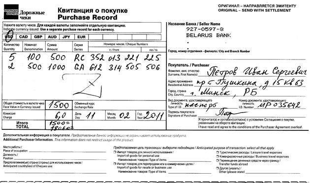 Остаток на _______ дорожных чеков в сумме _____________________________. (указывается дата, сумма остатка чеков в учреждении Банка, валюта чеков)