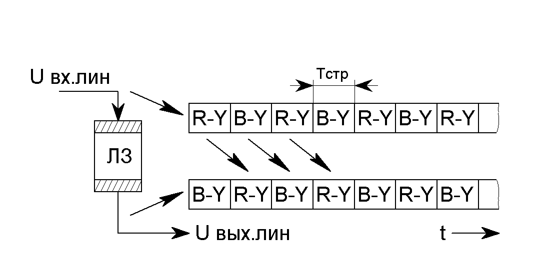 Работа системы SECAM основана на двух принципах: 1. В каждой строке передаётся только один сигнал цветности; 2. Преобразование ЦРС в сигналы цветности осуществляется методом частотной модуляции. Возможность поочерёдной передачи сигналов цветности основана на следующих соображениях. Как отмечалось в гл.II, неразличимость цвета мелких деталей позволяет ограничивать полосу частот сигналов цветности примерно до 1, 5 МГц. Так как полная полоса частот ТВ-спектра составляет 6 МГц и соответствует передаче наиболее мелких деталей, передаваемых в чёрно-белом виде яркостным сигналом ЕY, то окрашенные детали будут иметь размер вдоль строки, по крайней мере, в (6 МГц / 1, 5 МГц) = 4 раза большей, чем самые мелкие чёрно-белые детали. Аналогично можно считать допустимым увеличение в 3 – 4 раза размера окрашенных мелких деталей и в вертикальном направлении. На этом и основан принцип поочерёдной передачи ЦРС в системе SECAM: в течение одной строки передаётся сигнал ЕR – Y, в течение следующей – ЕB – Y и т.д. Таким образом, для передачи используется только часть информации, выдаваемой цветной камерой. Половина строк растра представлена в цветовом сигнале компонентой ЕR – Y, а другая половина – компонентой ЕB – Y. При этом предполагается, что в пропущенных строках цветовая информация практически идентична соседним. Иными словами, для сигналов цветности развёртка в полном кадре будет содержать вдвое меньшее число строк, что приводит к соответствующему увеличению размеров окрашенных мелких деталей по вертикали. Однако общая чёткость по вертикали при этом не упадёт, так как более мелкие детали передаются сигналом яркости ЕY с полным числом строк развёртки. В телевизионном приёмнике цветного изображения для правильной работы цветного кинескопа необходимо иметь одновременно три ЦРС: ЕR – Y, ЕG – Y и ЕB – Y. Для получения непрерывной последовательности сигналов ЕR – Y и ЕB – Y и формирования с помощью матрицы третьего ЦРС ЕG – Y в приёмнике системы SECAM используется ячейка памяти – линия задержки со временем задержки на одну строку τ ЗАД. = ТСТР. = 64 мкс. При воспроизведении цветного изображения каждый сигнал цветности используется дважды: один раз он берётся с входа линии задержки, а другой – с её выхода. Процесс формирования непрерывных сигналов ЕR – Y и ЕB – Y с помощью линии задержки поясняется на рис.3.1.