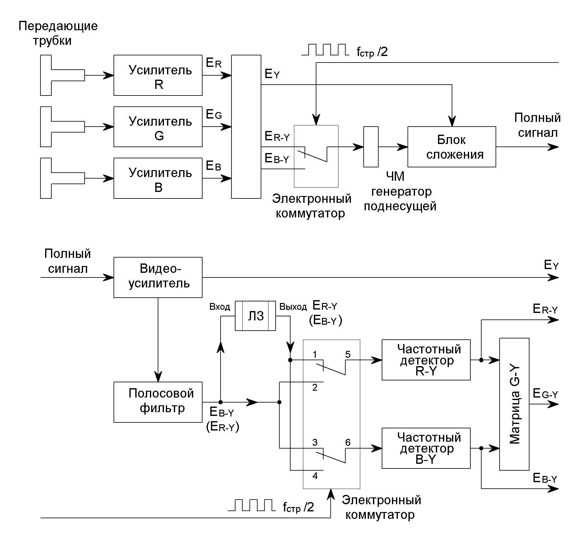 Так как сигналы цветности передаются поочерёдно через одну строку, а задержка линии равна длительности одной строки, сигналы цветности на входе и на выходе линии задержки оказываются различными, т.е. если в данный момент на входе линии имеется сигнал ЕR –Y, то на выходе будет сигнал ЕB – Y (или наоборот). Таким образом, линия задержки даёт возможность всегда иметь одновременно оба сигнала цветности. При этом, однако, предполагается, что в пропущенных строках цветовой сигнал практически не отличается от сигнала соседних строк. После восстановления непрерывности сигналов ЕR – Y и ЕB – Y можно получить с помощью матрицы сигнал ЕG – Y. Как видно из рис.3.1, сигналы ЕR – Y и ЕB – Y и на входе, и на выходе линии задержки периодически меняются местами. Отсюда возникает необходимость соответствующего переключения сигналов так, чтобы на вход канала обработки сигнала R–Y подавался сигнал ЕR – Y, а на вход канала B–Y – сигнал ЕB – Y. Для этого в приёмнике SECAM используется схема электронного коммутатора. Принцип построения системы SECAM в упрощённом виде поясняется структурными схемами передающей и приёмной части, показанными на рис.3.2.