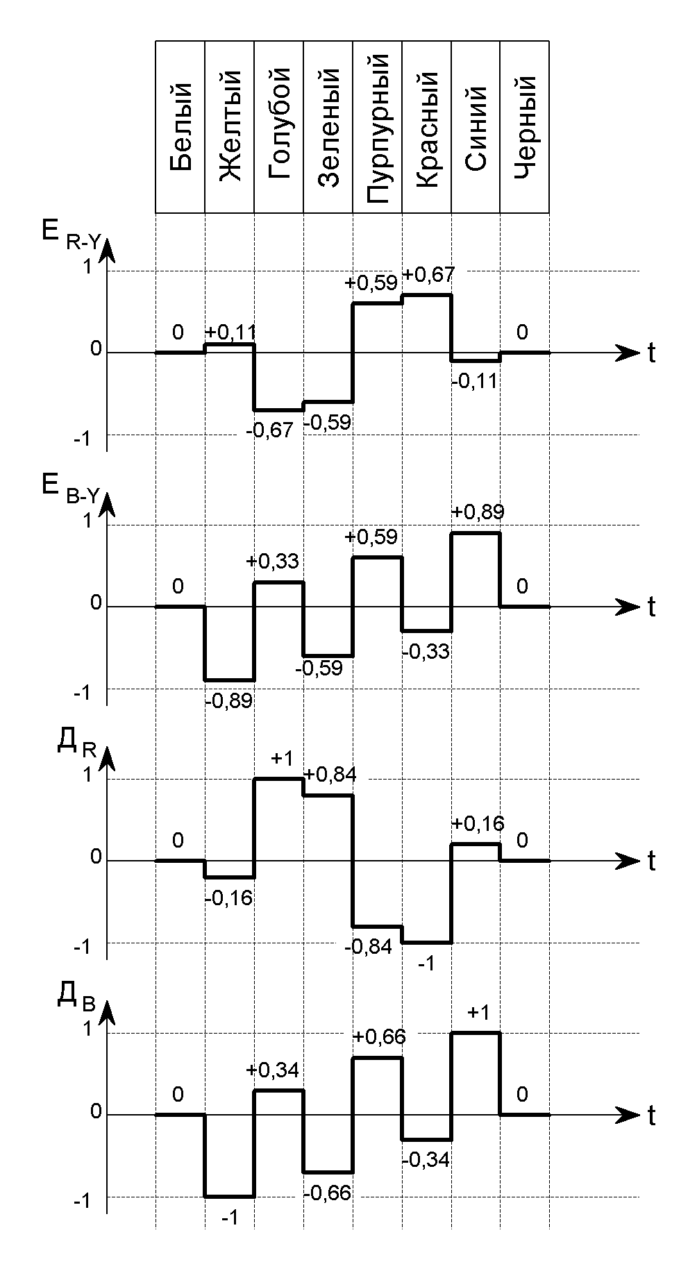 В процессе доработки системы SECAM неоднократно менялись её параметры. При рассмотрении упрощённых структурных схем передающей и приёмной частей мы считали, что передаются ЦРС ER – Y и EB – Y. В последней системе, принятой в СССР и стандартизированной, эти ЦРС заменены сигналами DR и DB. Новые сигналы формируются следующим образом: ДR = kR·ER – Y = – 1, 9ER – Y ДB = kB·EB – Y = 1, 5EB – Y …………….. (3.2), где kR = – 1, 9 и kB = 1, 5 – называются коэффициентами компрессии. Из этих соотношений видно, что сигналы DR и DB отличаются от ЕR – Y и ЕB – Y полярностью и наличием коэффициентов компрессии. Введение коэффициентов kR = – 1, 9 и kB = 1, 5 направлено на улучшение совместимости и повышение помехоустойчивости системы. Дело в том, что максимальные и минимальные значения ЦРС ЕR – Y и ЕB – Y различны. На рис.3.9 представлены осциллограммы сигналов ЕR – Y и ЕB – Y. Такие сигналы применяются при настройке телевизоров для получения изображения на экране в виде вертикальных цветных полос в следующей последовательности: белая, жёлтая, голубая, зелёная, пурпурная, красная, синяя, чёрная (Табл.3.1). Таблица 3.1