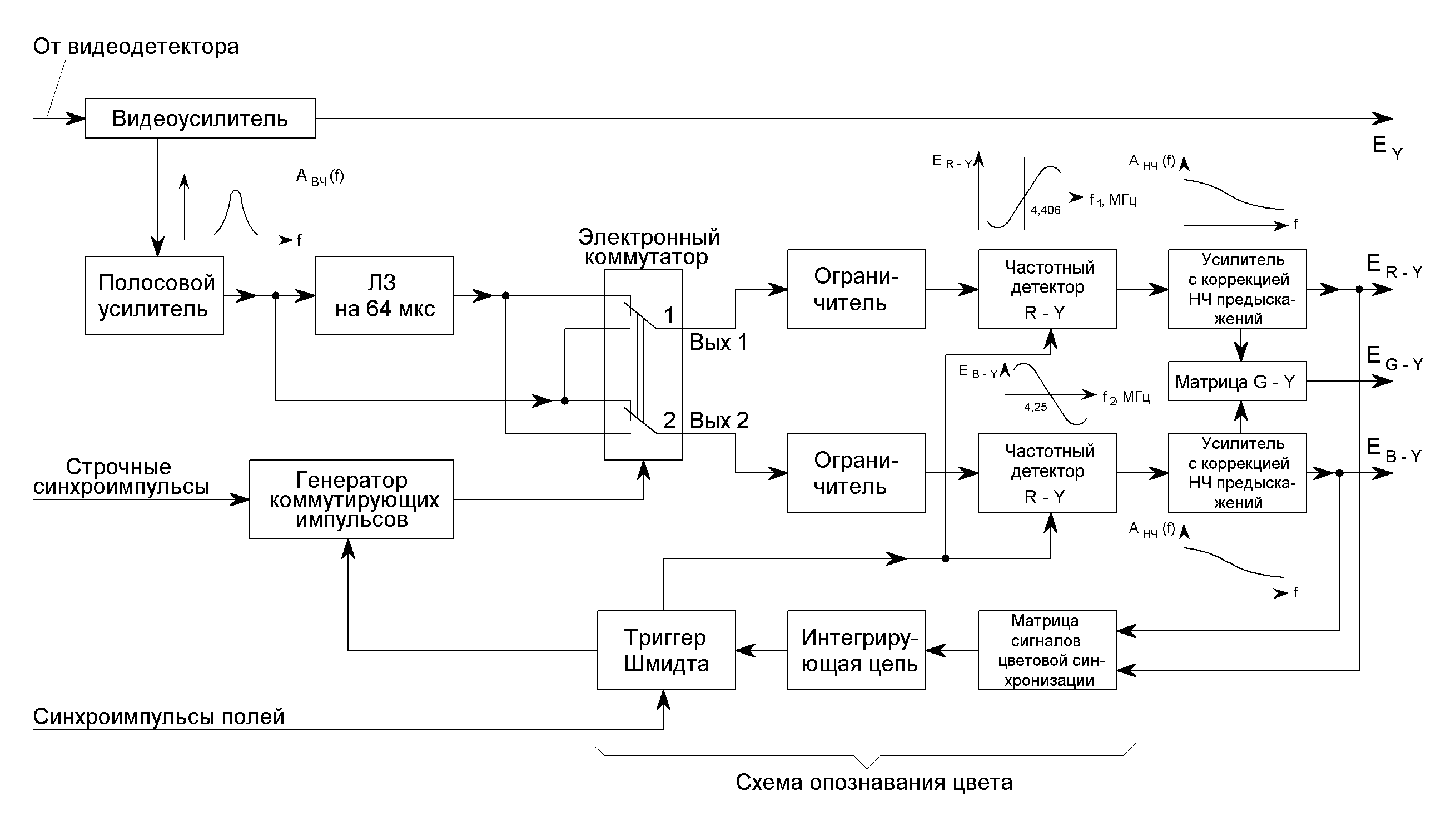 Сигнал с видеодетектора поступает на полосовой усилитель. В полосовом усилителе частотно-модулированные сигналы цветности отделяются от яркостного сигнала и корректируются частотные предыскажения цветовых поднесущих. Частотная характеристика корректирующего каскада имеет форму колокола. После усиления выделенного сигнала сигнал цветности поступает на электронный коммутатор и на вход линии задержки, время задержки которой равно периоду одной строки изображения (64 мкс). После электронного коммутатора сигналы цветности поступают на два амплитудных ограничителя, обеспечивающих двустороннее ограничение сигналов цветности. При этом устраняются импульсные помехи, попавшие в канал цветности, и паразитная амплитудная модуляция. Как видно из рисунка, АЧХ в каналах R–Y и B–Y, проходят через нуль при частотах 4, 406 и 4, 25 МГц соответственно, имеют линейный участок в диапазоне приблизительно 1, 5 МГц и являются как бы зеркальным отражением друг друга. Таким образом, увеличение частоты поднесущей на входе канала R – Y вызывает увеличение напряжения на его выходе, а аналогичное увеличение частоты на входе канала B – Y – соответствующее уменьшение напряжения. Электронный коммутатор и линия задержки необходимы для одновременного получения сигналов ЕR – Y и ЕB – Y на входе формирующей матрицы ЕG – Y. Таким образом, на первом выходе электронного коммутатора всегда имеется сигнал ЕR – Y, а на втором выходе – сигнал ЕB – Y. С выхода электронного коммутатора ЧМ-сигналы цветности поступают на частотные детекторы. Частотные детекторы (ЧД) преобразуют сигналы цветности в цветоразностные сигналы (ЦРС). На выходе «красного» ЧД формируется сигнал ЕR – Y, а на выходе «синего» ЧД – ЕВ – Y. Частотные детекторы в приёмнике системы SECAM выполняются по схеме фазовых дискриминаторов. Фазовые дискриминаторы в каналах R – Y и B – Y различаются частотами настройки резонансных цепей и амплитудно-частотными характеристиками, которые показаны на рис.3.13.