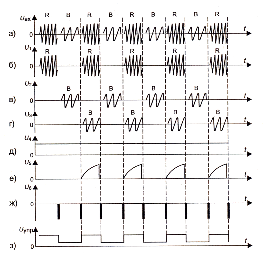 Рис.3.16. Эпюры сигналов в системе ЦС по полям: UВХ – входной сигнал; U1 – сигнал на выходе Ф1; U2 – сигнал на выходе Ф2; U3 – сигнал на выходе ЛЗ; U4 – импульс обратного хода по полю; U5 – сиг нал на выходе схемы И; U6 – строчные синхроимпульсы; UУПР – выходные сигналы схемы ЦС.