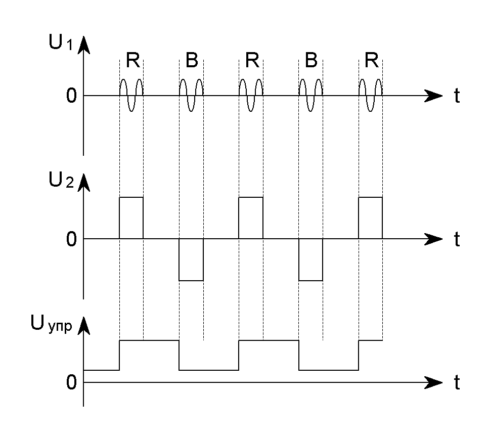 Рис.3.18. Эпюры сигналов в системе ЦС по строкам: U1 – сигналы «вспышки»; U2 – Сигналы на выходе ЧД; UУПР – выходные сигналы управления схемы ЦС.