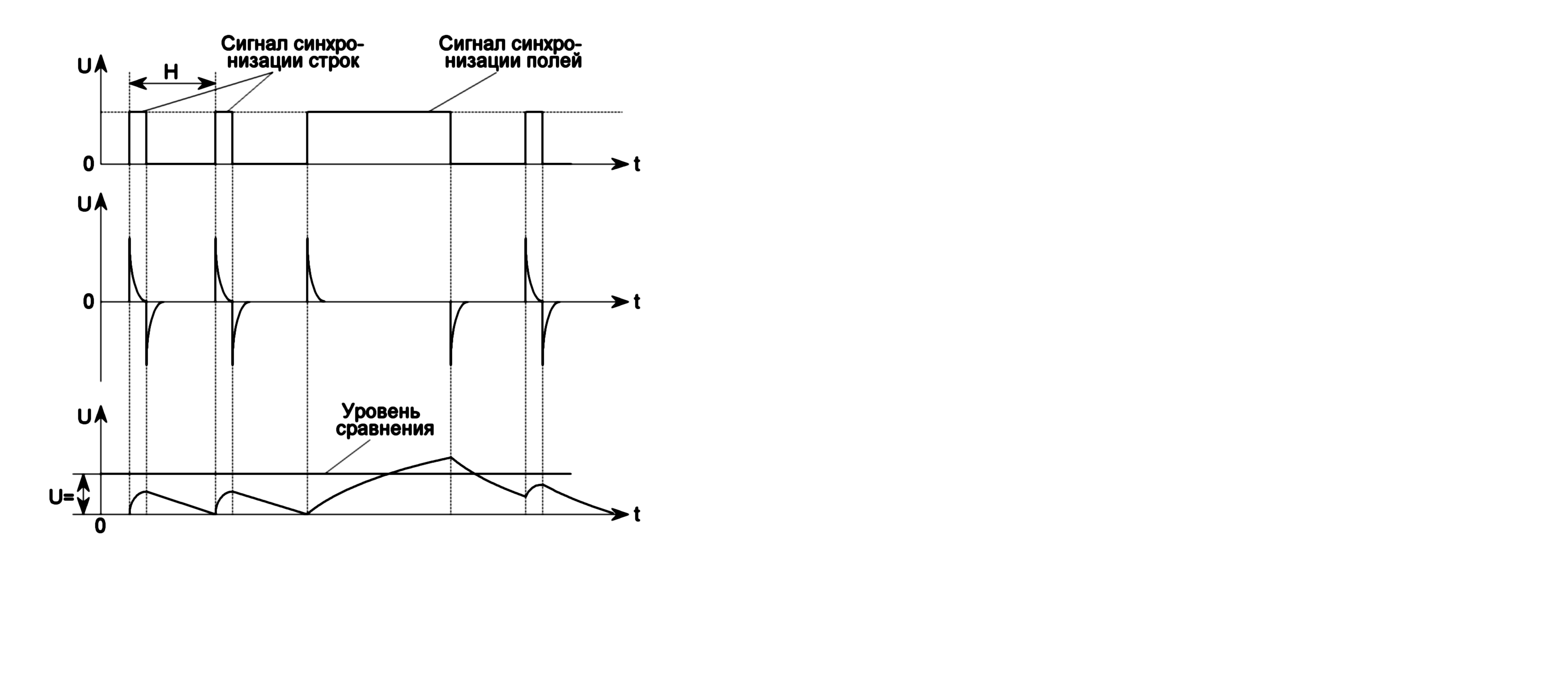 При подаче на вход ДЦ прямоугольного импульса положительной полярности на её выходе образуются два коротких импульса разной полярности. Положительный импульс соответствует переднему фронту входного импульса, а отрицательный – его заднему фронту (рис.6.1, б). Импульсами положительной полярности запускают генератор строчной (горизонтальной) развёртки. При подаче на вход ИЦ прямоугольного видеоимпульса на её выходе образуется экспоненциально нарастающее напряжение (рис.6.1, в). Это напряжение сравнивается с постоянным уровнем U= , и в момент равенства их величин формируется импульс, запускающий развёртку по полю (вертикальную развёртку). При поступлении на вход ИЦ синхроимпульса строк напряжение на её выходе не успевает нарасти до уровня сравнения и запуска развёртки не происходит. Рассмотренный способ синхронизации имеет два недостатка: 1. Во время передачи синхроимпульса полей отсутствует синхронизация генератора строчной развёртки, и он начинает работать в автоколебательном режиме без синхронизации. Поэтому после начала поля необходимо несколько строчных синхроимпульсов, чтобы привести генератор строчной развёртки в режим синхронизма; при этом нарушается изображение в верхней части экрана. 2. При чересстрочной развёртке момент запуска развёртки по полю в чётных полях (τ 1) начинается на полстроки (Н / 2 = 32 мкс) раньше, чем в нечётных полях (τ 2), что показано на рис.6.3. (Моменты запуска развёртки отсчитываются от начала синхроимпульса полей).