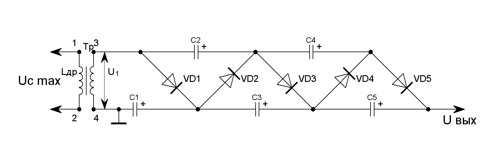 Рис. 7.14. Диодно-ёмкостный умножитель напряжения Схема работает следующим образом. Первый импульс О.Х. строчной развёртки U1 на вторичной обмотке трансформатора Тр заряжает конденсатор С1 по цепи: Тр (конт.3) → VD1 → С1 → корпус (конт.4). Конденсатор заряжается до напряжения, равного амплитуде импульса на вторичной обмотке трансформатора (U1). По окончании импульса конденсатор С1 разряжается через диод VD2 на конденсатор С2 по цепи: + С1 → VD2 → C2 → Тр (конт.3) → – С1 (корпус). Таким образом, к моменту прихода второго импульса О.Х. конденсаторы С1 и С2 оказываются заряженными до напряжения U1 / 2. Второй импульс О.Х. подзаряжает С1, а через диод VD3 заряжается конденсатор С3. По окончании второго импульса конденсатор С1 через диод VD2 вновь подзаряжает C2, а конденсатор С3через диод VD4 заряжает конденсатор С4. Таким образом, в процессе появления импульсов О.Х. на вторичной обмотке трансформатора происходит последовательный заряд всех конденсаторов схемы умножителя. В установившемся режиме каждый из конденсаторов оказывается заряженным до величины U1, поэтому выходное напряжение в данной схеме оказывается равным UВЫХ = 3U1. Другой схемой для получения высоковольтного напряжения является схема выпрямителя с диодно-каскадным трансформатором (ТДКС), изображённая на рис. 7.15.