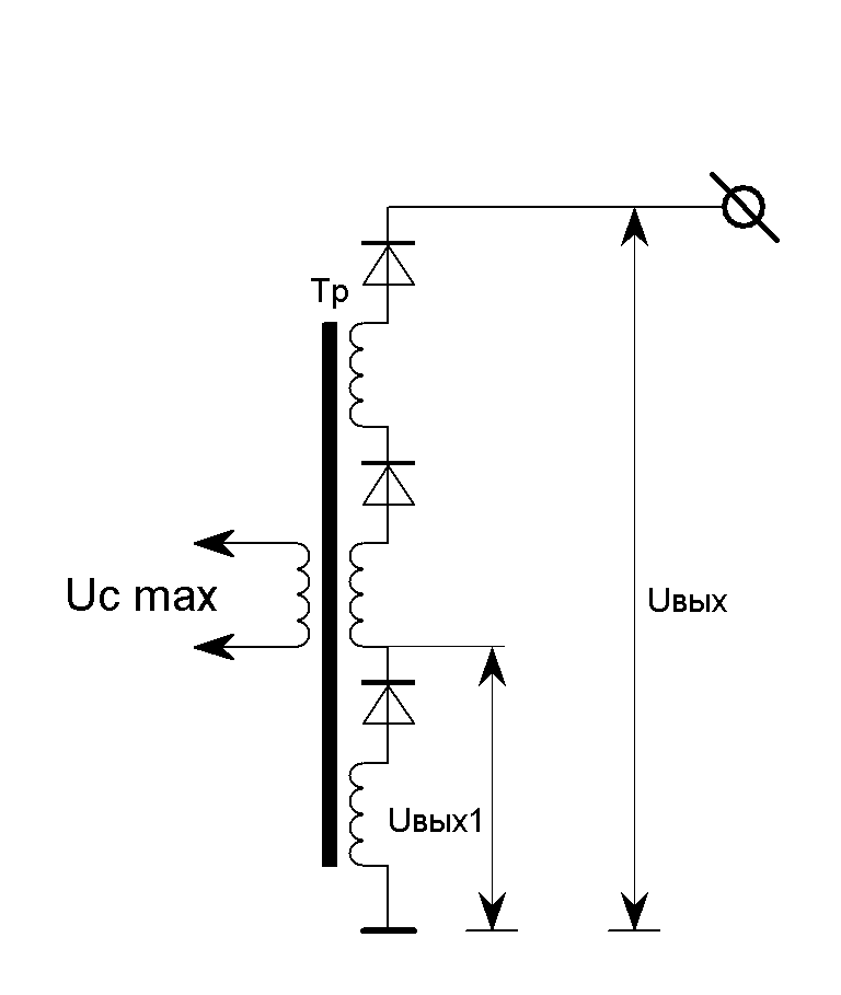 Рис. 7.15. Высоковольтный выпрямитель с ТДКС Схема представляет собой последовательное соединение трёх однополупериодных выпрямителей с тремя независимыми обмотками. Такая схема позволяет повысить электрическую прочность всего выпрямителя и уменьшить внутреннее сопротивление источника высоковольтного напряжения. Уменьшение внутреннего сопротивления источника делает более стабильным высокое напряжение при изменении токов лучей кинескопа.