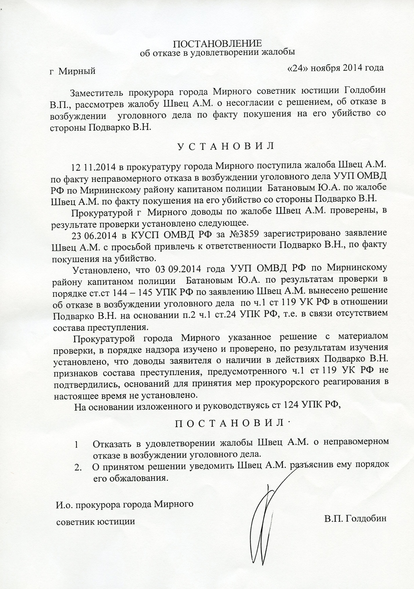 Получил очередную отписку от 24.11.2014г. №42ж-2014, за подписью И.о. прокурора города Мирного, советника юстиции В.П. Голдобина. «Установлено, что 03.09.2014 года УУП ОМВД РФ по Мирнинскому району капитаном Батановым Ю.А., по результатам проверки в порядке ст.ст. 144 – 145 УПК РФ по заявлению Швец А.М., вынесено решение об отказе в возбуждении уголовного дела по ч.1 ст. 119 УК РФ в отношении Подварко В.Н. на основании п.2 ч1. Ст.24 УПК РФ т.е. в связи с отсутствием состава преступления» «Кроме того, разъясняю, что в случае несогласия с постановлением об отказе в возбуждении уголовного дела от 03.092014г. Вы, вправе обратиться с постановкой соответствующих вопросов ОМВД России по Мирнинскому району Ощепкову А.И.» Извините! Как можно, с чем-то соглашаться или не соглашаться, если отписка с результатами расследования капитаном Батановым Ю.А., до сих пор не поступила заявителю Швец А.М.??? Всю корреспонденцию, доставляют до квартиры под роспись – возможно, капитан Батанов Ю.А., запамятовал, отправить отписку??? Настоятельно, прошу отправить отписку от 03.09.2014г., с которой вы ознакомились, и оснований для принятия мер прокурорского реагирования в настоящее время не установили!? По Закону, заявитель, должен был получить – отписку капитана Батанова Ю.А., но до сих пор не получил??? «В июле 11г. по см-с, пытался договориться с установкой двух стеклоблоков, мои см-с игнорировали, на контакт не шли. Благо, появилась случайная знакомая – заключила договор, а я, по см-с договорился с рассрочкой на месяц, в августе рассчитался в полном объёме. Стеклоблоки устанавливали с утра, и до позднего вечера, до 23 часов. На постели, на полу – толстый слой пыли. Мансур, первым делом: пылесосом собирал пыль, чтоб помыть полы, покупать меня, заменить постель. На лице такой же слой пыли, ждал с нетерпением: залезть в ванную, на душе облегчение – целую проблему решил. Стук в дверь: залетает соседка с нижнего, подо мной этажа, (тёткина подруга) с криками наорала, и так же, неожиданно «улетела». Буквально через 30 минут, залетает, даже не представился, потом выяснилось участковый лт. Батанов: на меня смотрел, как на «врага народа». Видит оснований, что-либо предъявить нет, вывел Мансура в подъезд: вернувшись, Мансур сказал – «под тебя копают». Начиная с июня, по моей просьбе: люди звонили в УВД, вызывали участкового, нашёл его номер, по см-с заявлял о совершённом насилии – с целью по всей форме, заявить в прокуратуру, не дождался! А, на шум бытового пылесоса мгновенно отреагировал! Этой же ночью в 4 утра, звонит Светка, которая навещала в августе 08 года, напросилась в гости, после 24 часов, следующего дня. Проснувшись задумался, почему ночью, а не днём, сразу понял, готовится провокация: стоит, выставить на стол спиртное, соседка вызывает – приезжают, составляют протокол. Из заявления склочницы, такой бардель, не в первой. Якобы: инвалид не в состоянии, контролировать ситуацию – выгонять пьяных гостей. Пищерский, как сосед подписывается, а как невропатолог, пишет заключение: о моём, якобы не адекватном состоянии здоровья. В результате – насильно выдворяют в дом престарелых. Пишу Светке см-с: «приходи до 20 часов, позднее дверь не открою» – не пришла, что и требовалось доказать. Даже если бы такое случилось, объявил бы голодовку – лучше принять смерть, чем по жизни жить в неволе! Чтоб хоть, как-то защититься на этот раз, уже от 