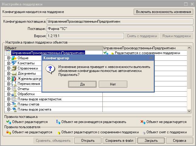Подготовка информационной базы к работе 1. Общие настройки ПП «1С: УПП 8» и первоначальное заполнение справочников Удаление встроенного плана счетов бюджетирования В системе уже заложен некоторый план счетов для бюджетирования. Он достаточно подробный. Но непосредственно в системе эти счета удалить нельзя. В некоторых случаях удобнее создать свой план счетов, для этого необходимо воспользоваться конфигуратором. Снимем конфигурацию с поддержки: «Конфигурация – Поддержка – Настройка поддержки». Далее нажмем на кнопку «Включить возможность изменения», соглашаемся, что «изменение режима приведет к невозможности выполнять обновление конфигурации полностью автоматически» и закрываем окно «Настройка поддержки».