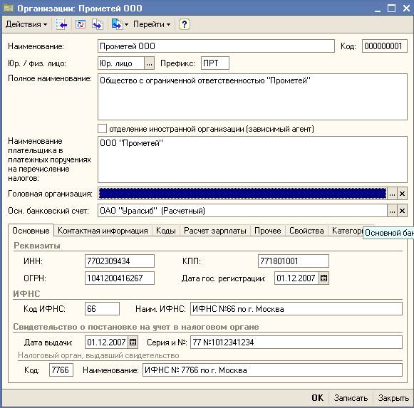 1.3. Ввод сведений об организации ООО «Прометей» В подсистеме «Полный интерфейс» (меню «Справочники – Организации – Организации) создаем организацию ООО «Прометей»:
