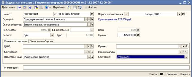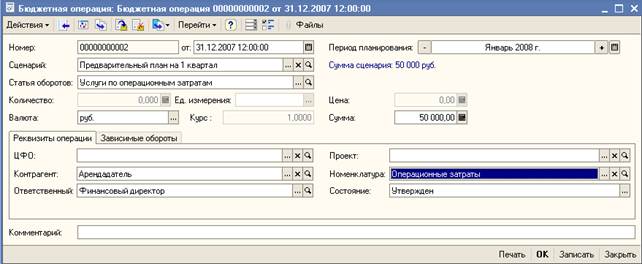 1. Ввод бюджетных данных с помощью документа «Бюджетная операция» Документ «Бюджетная операция» является основным документом подсистемы бюджетирования, особенно при преобладающем стиле планирования «снизу вверх». В документе фиксируется планируемый оборот по определенной статье за период, продолжительность которого определяется периодичностью планирования сценария.
