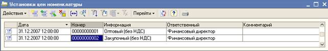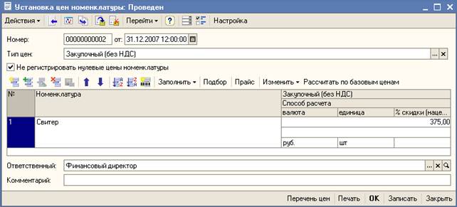 Рис. 138 2. Ввод бюджетных данных с помощью документа «Расчет по модели бюджетирования» Предварительно необходимо настроить закупочные и оптовые цены на свитеры. Интерфейс «Управление продажами», меню «Цены – Установка цен номенклатуры».