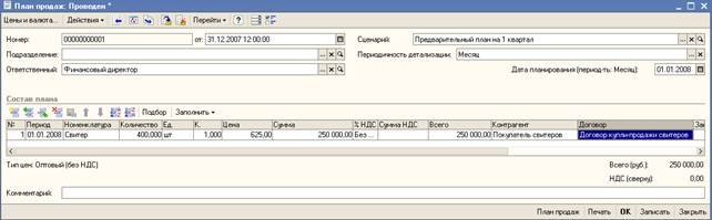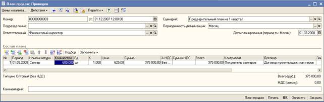 2.1. Формирование планов продаж Сформируем планы продаж на 1 квартал 2008 года: · План продаж на январь 2008 года; · План продаж на февраль 2008 года; · План продаж на март 2008 года. Интерфейс «Планирование», меню «Документы – План продаж». План продаж на январь 2008 года