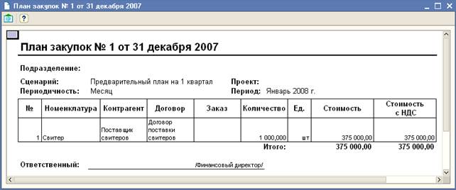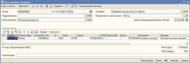 2.2. Формирование планов закупок Сформируем планы закупок на 1 квартал 2008 года: · План закупок на январь 2008 года; · План закупок на февраль 2008 года; · План закупок на март 2008 года. Интерфейс «Планирование», меню «Документы – План закупок». План закупок на январь 2008 года