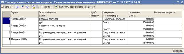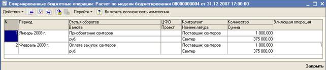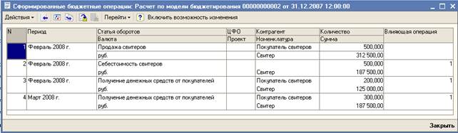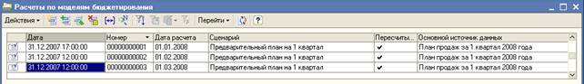 В нашем случае источниками данных для расчета будут являться документы, сформированные ранее (см. п. 2.5): · «Источник данных для расчетов бюджетирования: План продаж за 1 квартал 2008 года»; · «Источник данных для расчетов бюджетирования: План закупок за 1 квартал 2008 года».