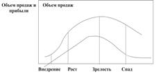 Рис. 8. Изменение объема продаж и прибыли на протяжении жизненного цикла Внедрение - период медленного увеличения объема продаж в момент, когда товар только поступает на рынок и завоевывает покупателей В связи с большими затратами компании во время внедрения товара, прибыль на этом этапе отсутствует Рост - период быстрого признания товара потребителями и значительного «увеличения прибыли. Зрелость - период замедления темпов роста объема продаж, поскольку товар нашел признание у большой группы покупателей. Прибыль стабилизируется или начинает снижаться за счет роста затрат на маркетинговые мероприятия, проводимые в целях отражения атак конкурентов. Спад — период снижения объема продаж и уменьшения прибыли. Определить начало и завершение каждого этапа достаточно сложно. Это становится возможным, только когда рост или падение объема продаж очевидны. Однако производителю следует знать, какова продолжительность этапов, характерных для его отрасли. Жесточайшая конкуренция на рынке приводит к уменьшению длительности жизненного цикла товара, а это означает, что товары должны приносить прибыль за более короткий период времени.