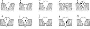 Рис. 5.4. Дефекты сварных стыков: 1 – подрез; 2 – отсутствие усиления; 3 – чрезмерное усиление; 4 – пористость; 5 – шлаковые включения; 6 – наружная трещина; 7 – внутренняя трещина; 8 – непровар корня шва; 9 – боковой непровар; 10 – прожог. Трубы из цветных сплавов. Импульсные газопроводы для присоединения контрольно-измерительных приборов и приборов автоматики должны быть, как правило, изготовлены из стальных труб для газопроводов соответствующего давления. Однако для их подключения допускается применять медные, круглые, тянутые, холоднокатаные трубы общего назначения в соответствии с требованиями ГОСТ 617-72 из меди марок Ml, Mlp, M2, М2р, МЗ, МЗр по ГОСТ 859-78, томпака марки Л96 по ГОСТ 15527-70. Наружный диаметр названных труб — 3–30 мм, толщина стенок — 0, 5–5, 0 мм. Допускаются к применению тянутые, холоднокатаные латунные трубы (латунь марок Л63 и Л68) общего назначения (ГОСТ 494-76). Тянутые и холоднокатаные трубы выпускаются в следующих исполнениях: мягкие М и полутвердые ПТ (со снятыми внутренними растягивающими напряжениями), наружный диаметр — 3–60 мм, толщина стенки — 0, 5–5, 0 мм.