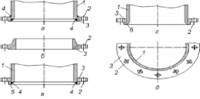 Рис. 5.10. Линзовый компенсатор. 1 – патрубок; 2 – фланец; 3 – рубашка; 4 – полулинза; 5 – ребро; 6 – лапа; 7 – гайка; 8 – тяга. Компенсаторы применяются для снижения напряжений, вызванных перепадами температуры грунта на фланцы чугунной арматуры, а также для возможности демонтажа, смены прокладок и последующей их установки. Линзовые компенсаторы, устанавливающиеся на подземных газопроводах в колодцах совместно с арматурой, выполняются из тонколистовой стали в виде отдельных свариваемых между собой полулинз. Для обеспечения нормальных условий демонтажа и монтажа, а также для снятия температурных напряжений с фланцев арматуры применяются двухлинзовые компенсаторы, состоящие из четырех полулинз. Линзовые компенсаторы устанавливают в сжатом состоянии с учетом их максимальной компенсирующей способности и осевых усилий. Под максимальной компенсирующей способностью компенсатора понимается двухстороннее изменение его длины. Для многолинзового компенсатора эту способность определяют суммой компенсирующей способности отдельных линз.